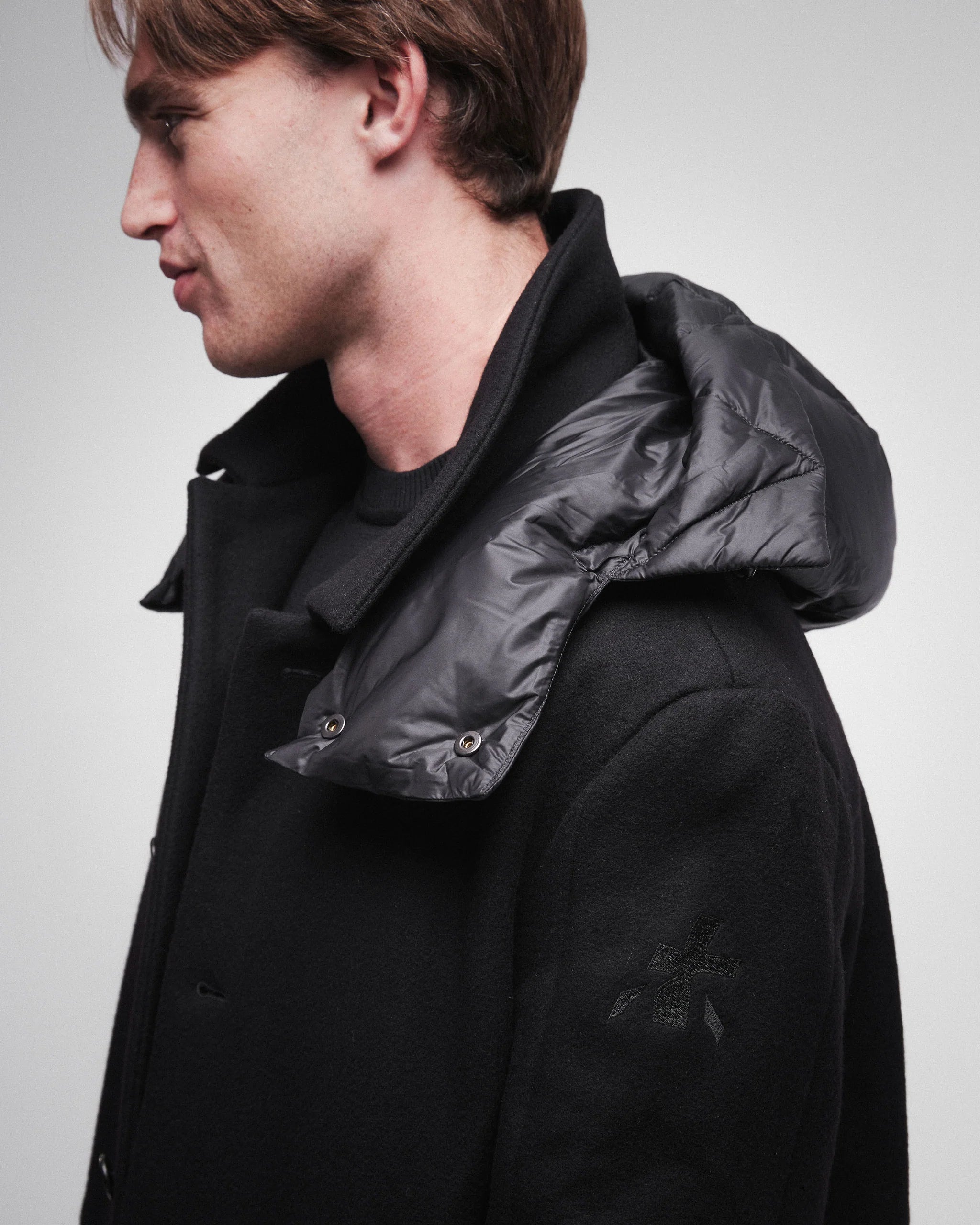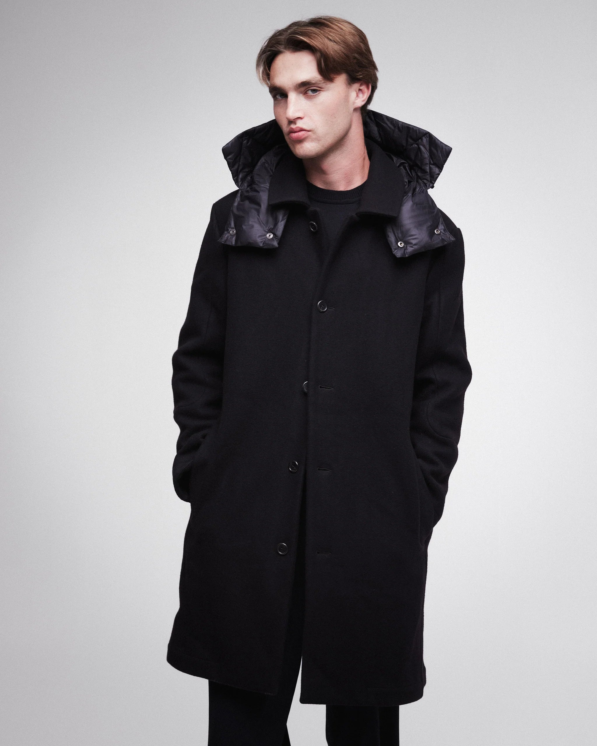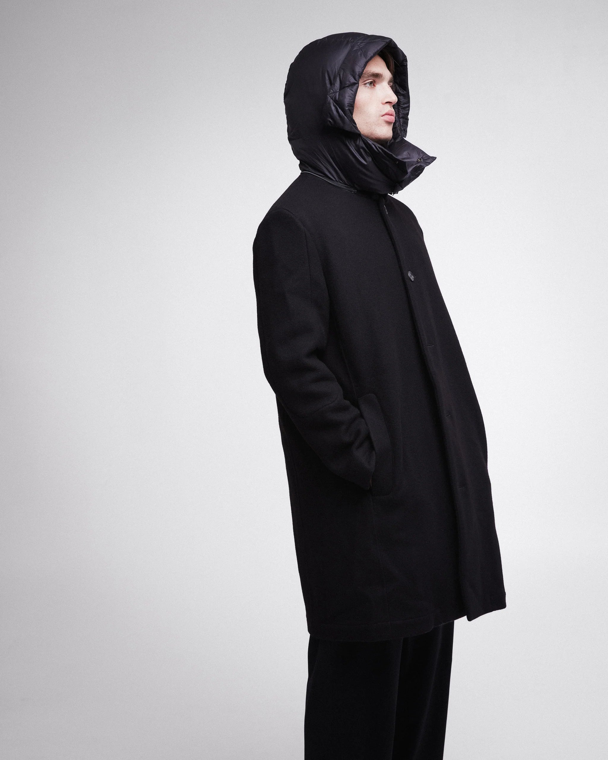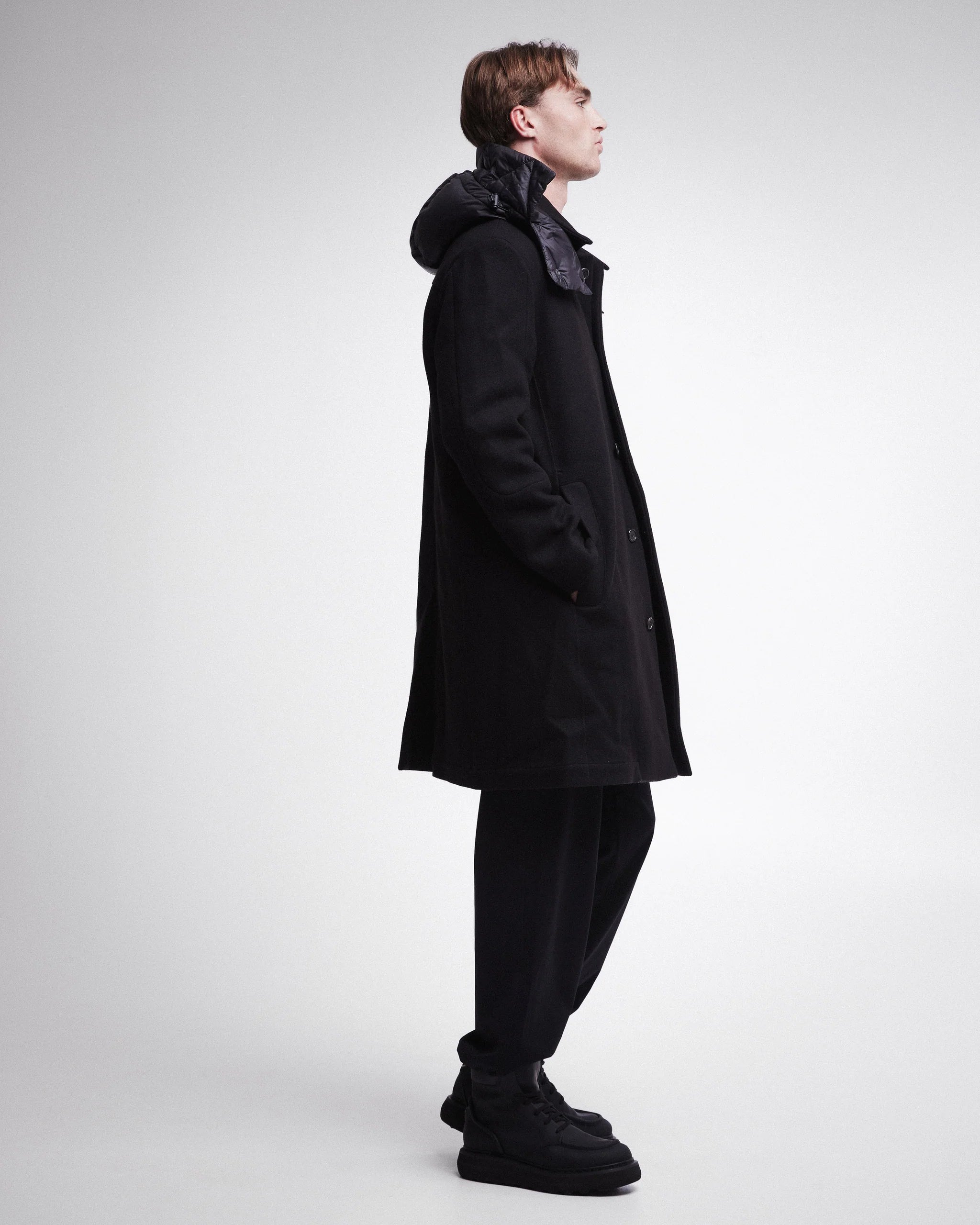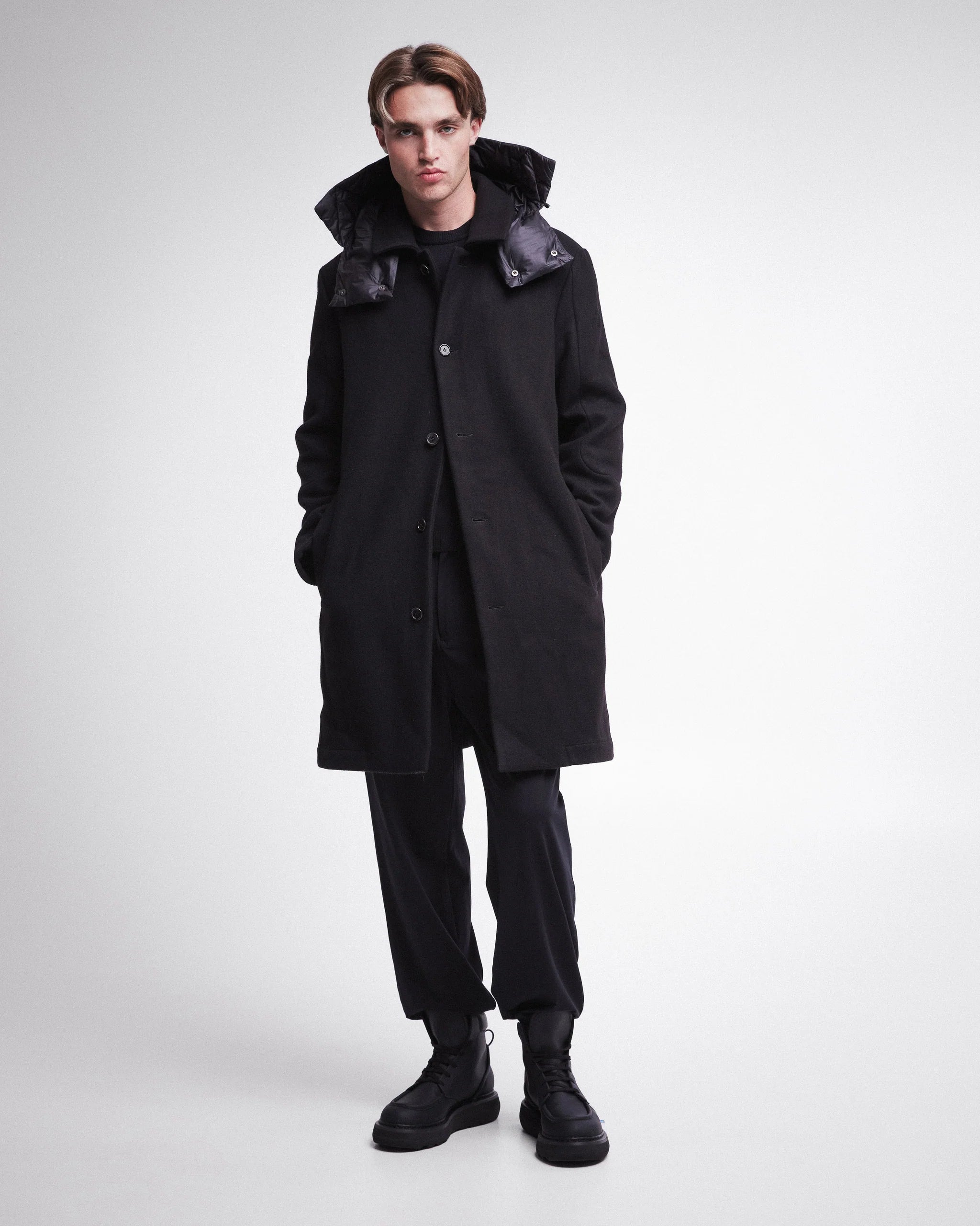 This sleek, black overcoat from Premiata is the epitome of refined outerwear. Designed for modern sophistication, the coat features a clean, streamlined silhouette with a button-up closure and a detachable padded hood for added warmth and style. The coat's simple yet luxurious construction makes it versatile for a variety of occasions, whether you are dressing up for a formal event or need a polished look for casual outings. The coat balances warmth, comfort, and elegant style in one timeless piece.